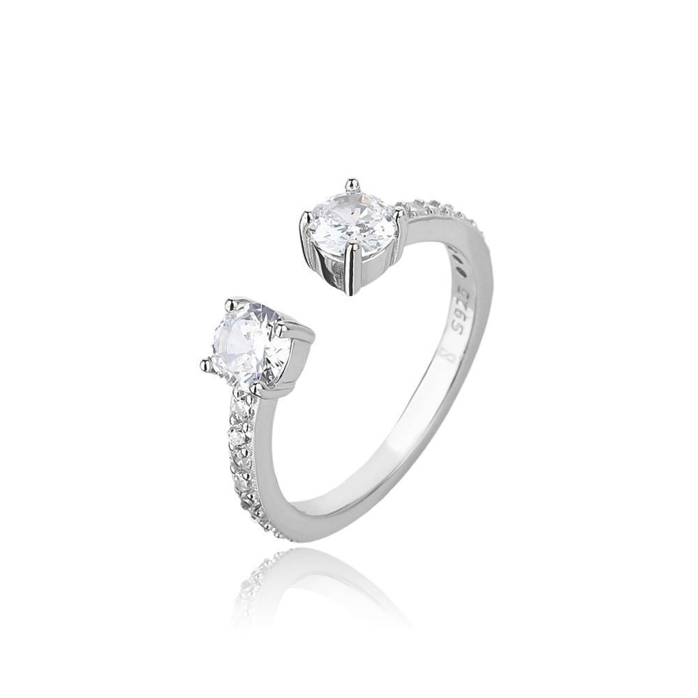 טבעת כסף אלגנטית בעיצוב פתוח ייחודי, הכוללת שני זרקונים מרכזיים מרשימים המשובצים זה מול זה. שיבוץ האבנים הקטן לאורך החישוק מוסיף ברק עדין ומעצים את המראה היוקרתי.